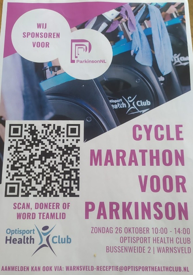 Op zondag 26 oktober wordt in de Optisport Health Club een Cycle Marathon voor Parkinson georganiseerd. Meld je aan als je geïnteresseerd bent en dit goede doel wilt steunen.